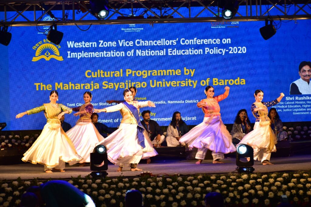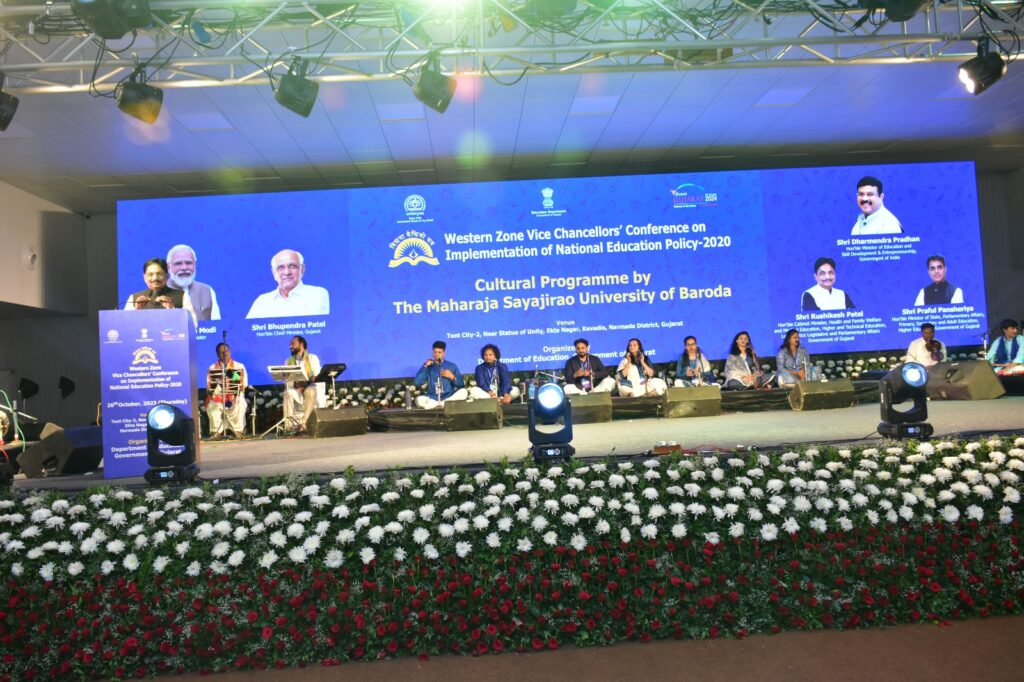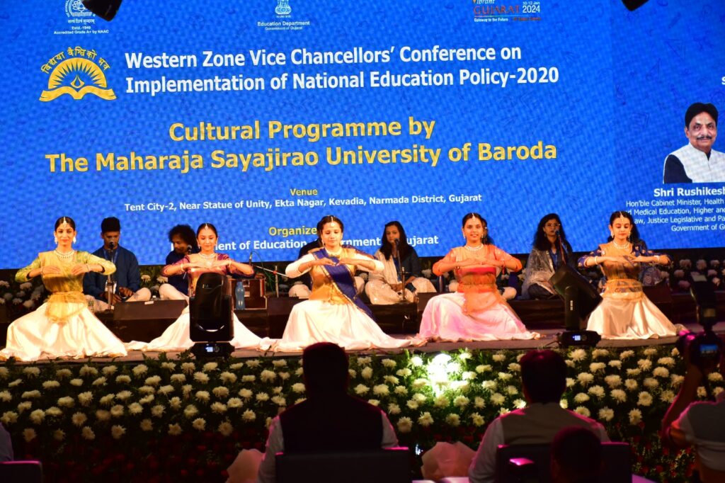 રાજપીપલા, બુધવાર :- સરદાર વલ્લભભાઈ પટેલની વિશ્વની વિરાટતમ પ્રતિમાના સાનિધ્યમાં અને પ્રાકૃતિક સૌંદર્ય વચ્ચે આવેલા એકતાનગર સ્થિત ટેન્ટસીટી-૨ ખાતે વાઈબ્રન્ટ ગુજરાત ૨૦૨૪ ના પ્રિ-ઇવેન્ટના ભાગરૂપે વેસ્ટર્ન ઝોન વાઈસ ચાન્સેલર્સ કોન્ફરન્સ “રાષ્ટ્રીય શિક્ષણ નીતિ ૨૦૨૦” માં શિક્ષણવિદો અને તજજ્ઞો વચ્ચે થનારા મનોમંથનની પૂર્વ સંધ્યાએ ગુજરાતના આરોગ્ય, પરિવાર કલ્યાણ અને તબીબી શિક્ષણ, ઉચ્ચ અને ટેક્નિકલ શિક્ષણના મંત્રીશ્રી ઋષિકેશભાઈ પટેલની અધ્યક્ષતામાં અને રાજ્ય શિક્ષણમંત્રીશ્રી પ્રફુલભાઈ પાનેસરિયા અને શિક્ષણ વિભાગના અગ્ર સચિવશ્રી મુકેશ કુમાર તથા વાઈસ ચાન્સેલરશ્રી અને રજીસ્ટારશ્રીઓની ઉપસ્થિતિમાં મહારાજા સયાજીરાવ યુનિવર્સિટી વડોદરા દ્વારા રંગારંગ સાંસ્કૃતિ કાર્યક્રમ યોજાયો હતો.