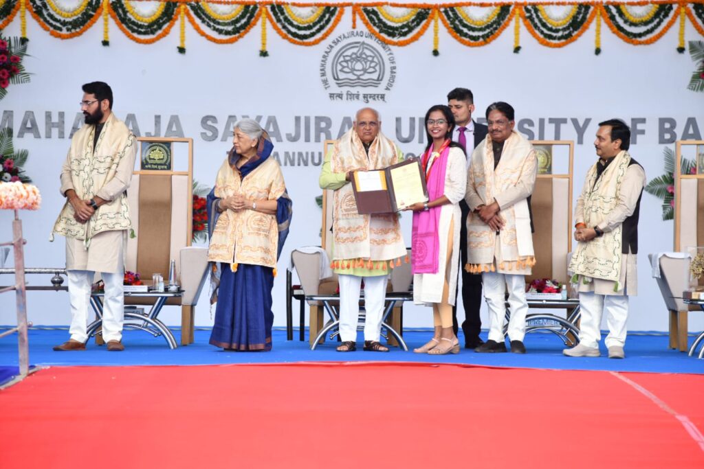 ડિગ્રી મેળવનાર વિદ્યાર્થીઓને ઉજ્જવળ ભવિષ્યની શુભકામનાઓ પાઠવતા ચાન્સેલર રાજમાતા શ્રી શુભાંગિનીદેવી ગાયકવાડે પદવિધારકોને માનવકલ્યાણ અને સમૃદ્ધિ માટે સખત મહેનતથી કામ કરવાનો માર્ગ પ્રશિસ્ત કરી પોતાના ચારિત્ર્ય, સંસ્કાર થકી યુનિવર્સિટીનું નામ ગૌરવાન્તિ કરવા જણાવ્યું હતું. આજે તમે વિદ્યાર્થી જીવનમાંથી સમાજ જીવનમાં પદાર્પણ કરી રહ્યા છો, ત્યારે મેળવેલ શિક્ષણને આત્મસાત કરી સમગ્ર વિશ્વમાં ભારતનું નામ રોશન કરો એવી શુભેચ્છાઓ પાઠવી વડોદરાના રાજવી પરિવારે આ યુનિવર્સિટી માટે આપેલા અમૂલ્ય યોગદાનની વિગતો પણ તેમણે વર્ણવી હતી.