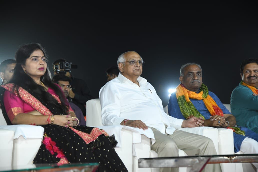 કેસરિયા ગરબા મહોત્સવ ના આયોજક અને ગાંધીનગરના ધારાસભ્ય શ્રીમતી રીટા બહેન પટેલ, શ્રી કેતન ભાઇ પટેલ અને પૂર્વ ધારાસભ્ય અશોક ભાઇ પટેલે મુખ્યમંત્રીશ્રીનું સ્વાગત અભિવાદન કર્યું હતું.